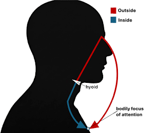 1-“From inside”: attention is oriented through an activity in the throat region, moving from its interior and proceeding inward toward the part of the body on which it focuses. This subtle inner posture seems to be more closely related to emotions (see emotion and attention).